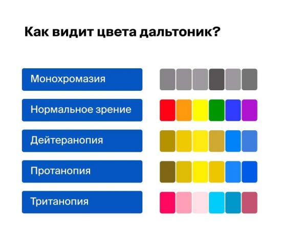 #Дальтонизм — это наследственная или приобретённая аномалия органа зрения, при котором человек не различает один или несколько цветов. Чаще встречается у мальчиков и реже у девочек. Цвета, которые не распознает человек с дальтонизмом, для него выглядят серыми. Листайте карусель, чтобы увидеть, как выглядит одно и тоже изображение при обычном зрении и зрении с дальтонизмом!